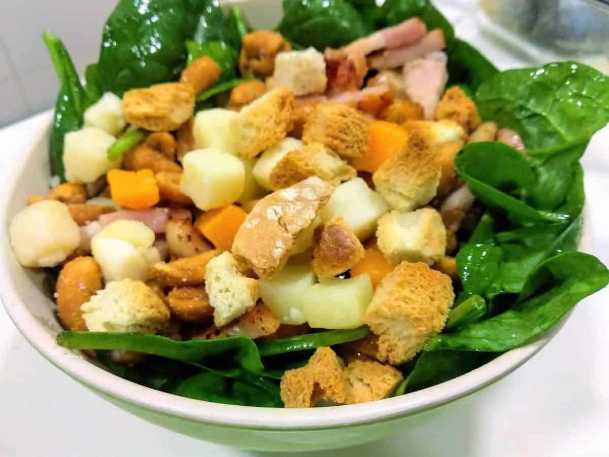 Debemos de evitar añadir a las ensaladas ingredientes rebozados y elegir mejor ingredientes a la plancha. Si añadimos alimentos rebozados como son el pollo, vamos a añadir calorías extra a nuestra ensalada. Así que si el objetivo es no engordar o bajar de peso, vamos a elegir pollo a la plancha o salmón a la plancha, entre otros.