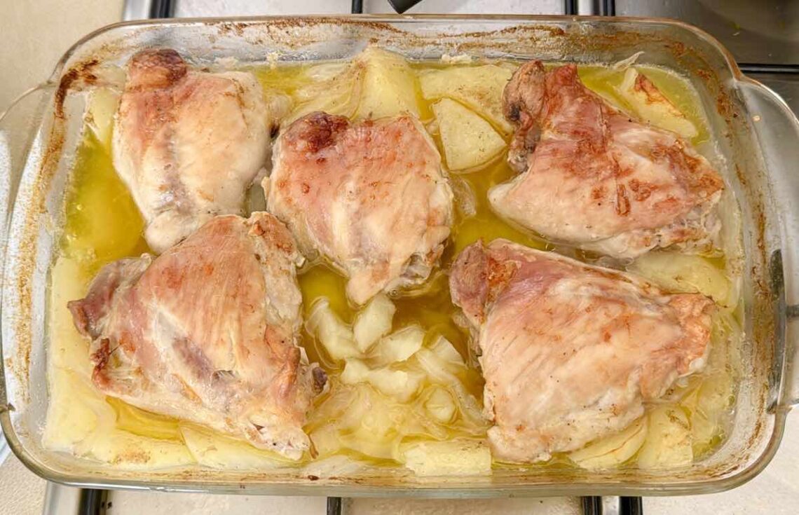 7. Colocamos los contramuslos de pollo encima de las patatas y la cebolla.