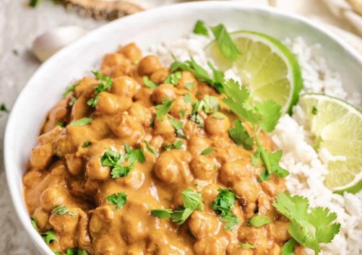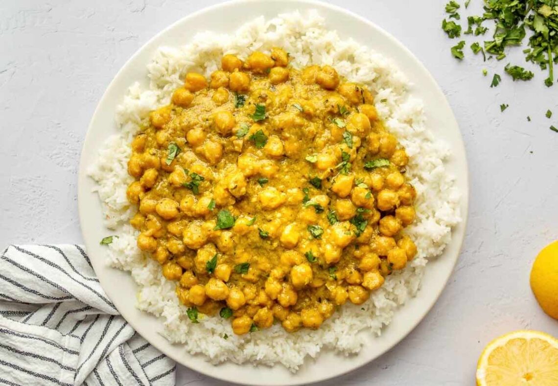 - Servimos el curry de garbanzos sobre una base de arroz o quinoa.