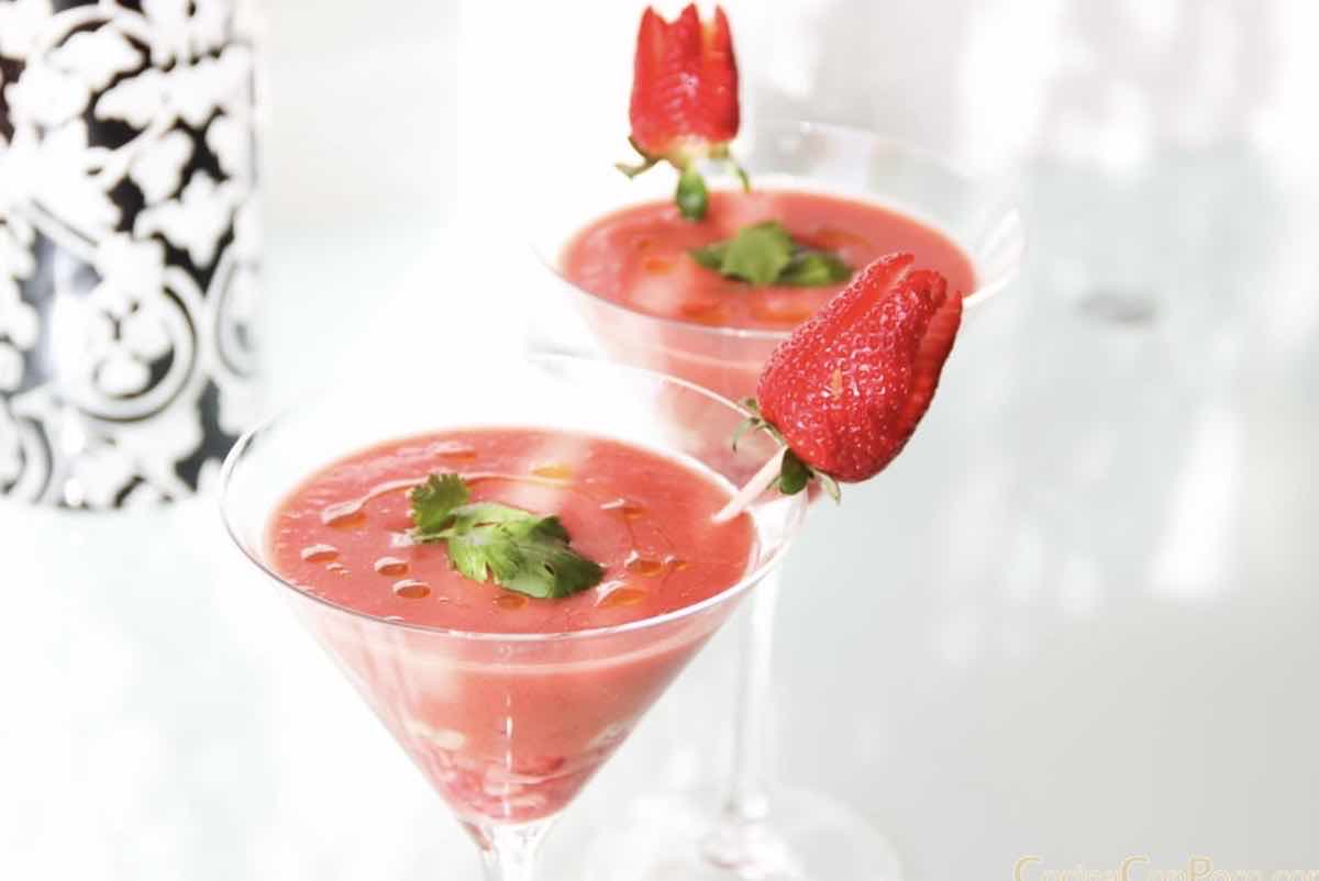 Quizás te resulte raro añadir fresas a un gazpacho, pero ¿cuántas veces has probado un plato con una combinación extraña de ingredientes? Seguro que muchas, y la mayoría te han gustado. El gazpacho de fresas te encantará, la mezcla de todos los ingredientes nos aporta un mix de sabores donde destaca ese toque afrutado que nos ofrecen las fresas. Este gazpacho te va a sorprender.
