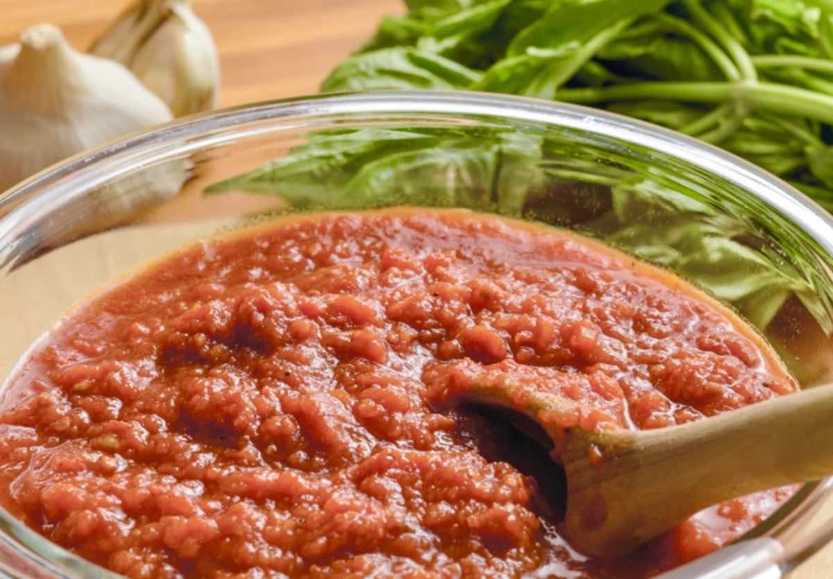 Para hacer la salsa napolitana vas a necesitar tomate, ajos, cebolla, albahaca, pimienta negra y aceite de oliva virgen extra. Según el tipo de tomate que escojas necesitarás corregir el punto de acidez ya sea con azúcar o bicarbonato, así que vas a tener que ir probándola a medida que la vayas haciendo. Para esta receta yo utilizo tomate natural triturado porque me es más sencillo y la salsa se hace en menos tiempo. Pero también puedes utilizar tomate natural en conserva o tomate natural de la huerta.