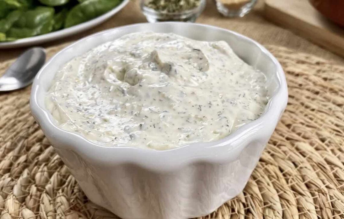 La salsa ranch o ranchera que más me gusta está hecha a base de mayonesa, yogur griego, ajo en polvo, cebolla en polvo, perejil, eneldo, pimienta negra y zumo de limón. Una vez se hayan mezclado todos los ingredientes y todos los sabores os vais a sorprender del increíble sabor que tiene. La mayonesa la puedes hacer casera en un momento o decantarte por la que viene ya envasada, con esta última te aguantará un poco más en la nevera.