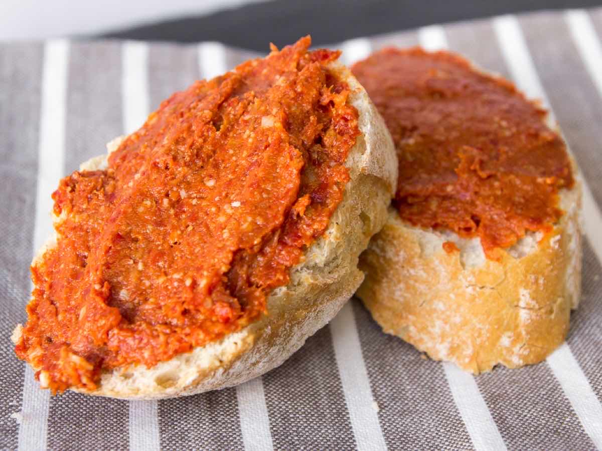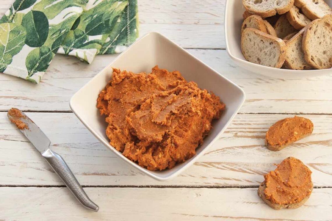 Para hacer la sobrasada vegana vas a necesitar tomates secos, anacardos, pimienta negra, pimentón dulce, comino, ajo en polvo, sal y aceite de oliva virgen extra. Opcionalmente puedes agregar pimentón picante para darle un extra de sabor, así como sustituir los anacardos por nueces. Lo cierto es que la sobrasada vegana es perfecta para dipear con pan tostado en un aperitivo familiar o con amigos. Sírvela también junto a un guacamole casero o un hummus de garbanzos.